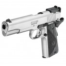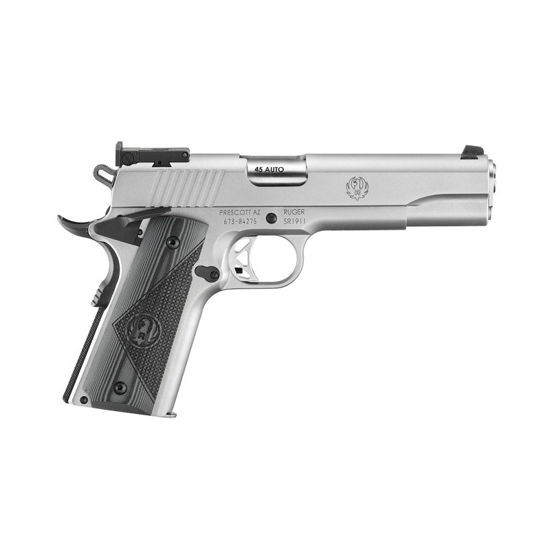 La nueva Ruger SR1911 Target cuenta con un cañón de acero inoxidable de 5" y pesa 1.105g. con cargador vacío. La pistola se envía con un cargador de acero inoxidable de 7 balas y otro de 8 balas, una llave para el bushing y dispositivo de bloqueo. La combinación de características que ofrece la nueva SR1911 Target da como resultado disparos rápidos y precisos y la legendaria fiabilidad y robustez que es el sello distintivo de las armas de fuego Ruger.