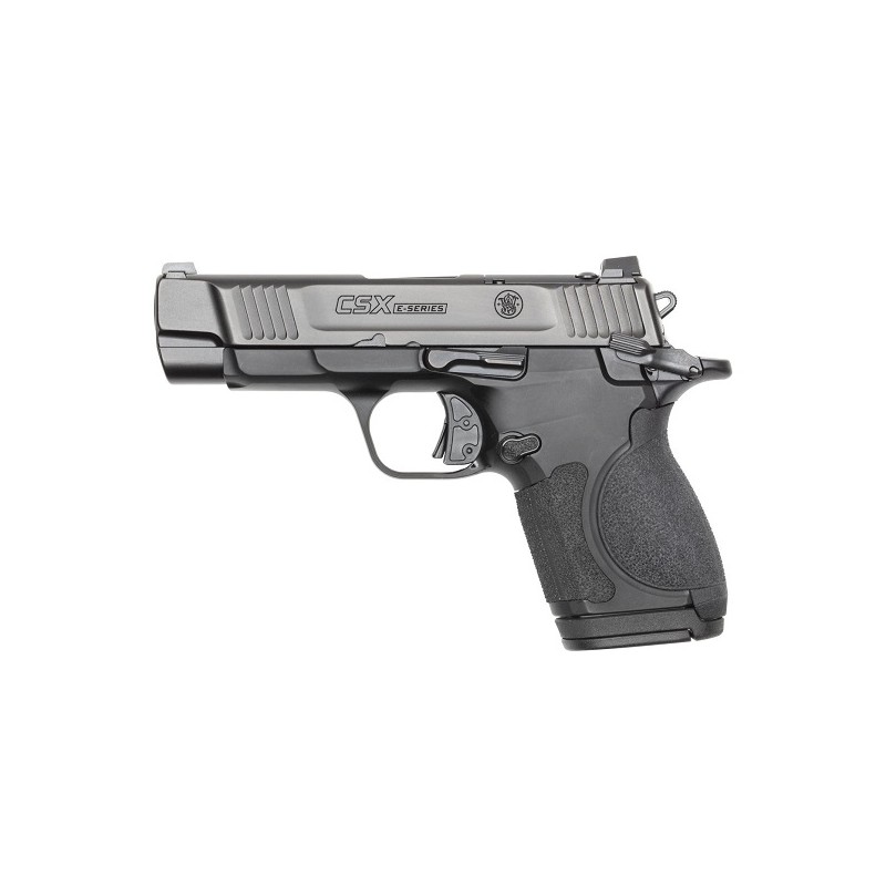 La nueva Smith & Wesson CSX E-Series, es la siguiente evolución en la línea CSX. Cuenta con un disparador mejorado de la serie E con salida limpia y sin arrastres, una amplia cobertura de textura en la empuñadura y un adaptador de empuñadura modular que permite convertir el arma de un tamaño de armazón microcompacto a compacto. Esta pistola lista para montaje de óptica y viene con diferentes op